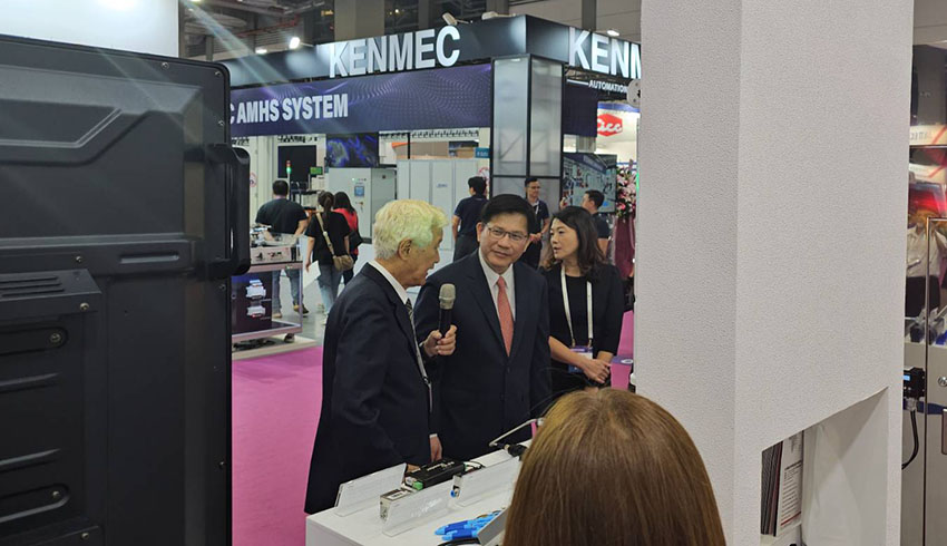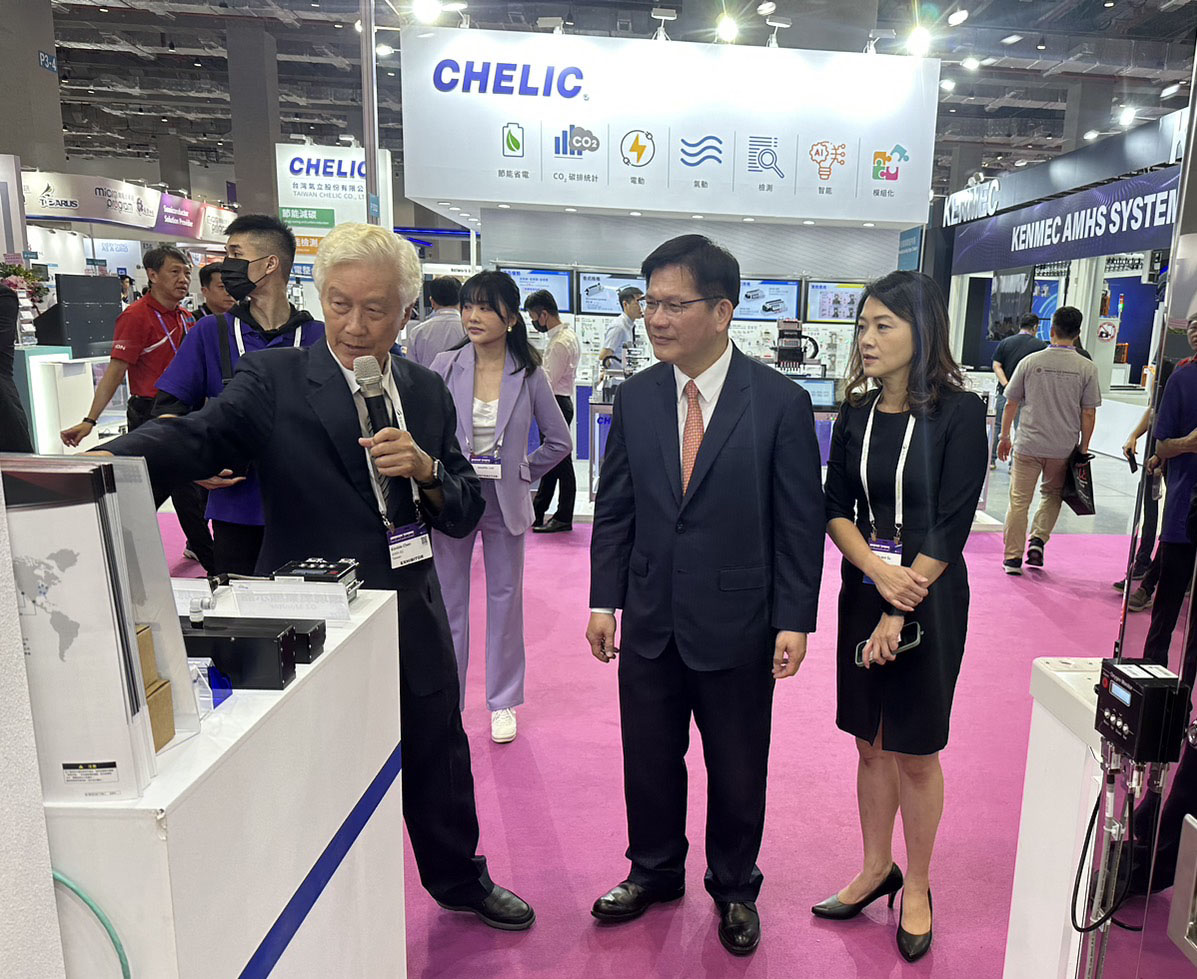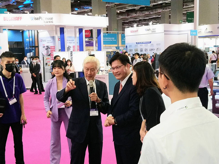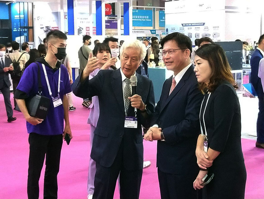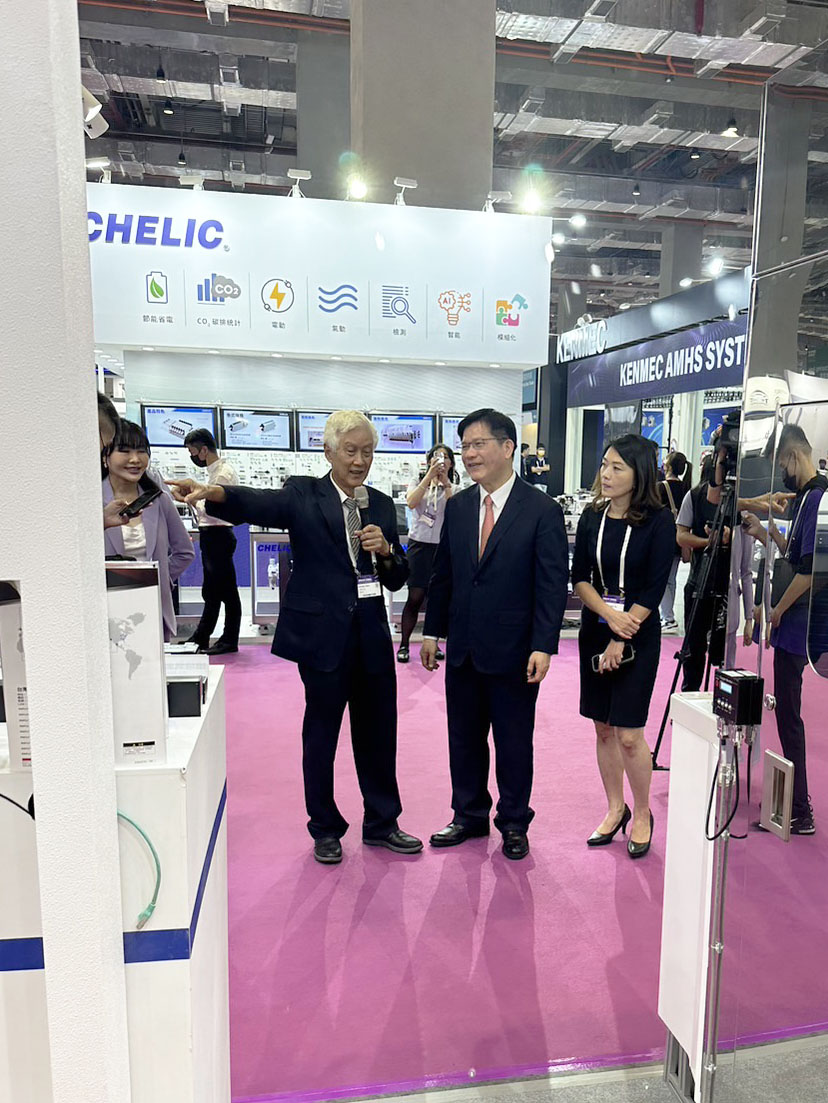 總統府秘書長 林佳龍 (前台中市長 , 交通部長) 也蒞臨台北半導體展 , 陳金柏董事長親自迎接及介紹本次的展出理念及展品。