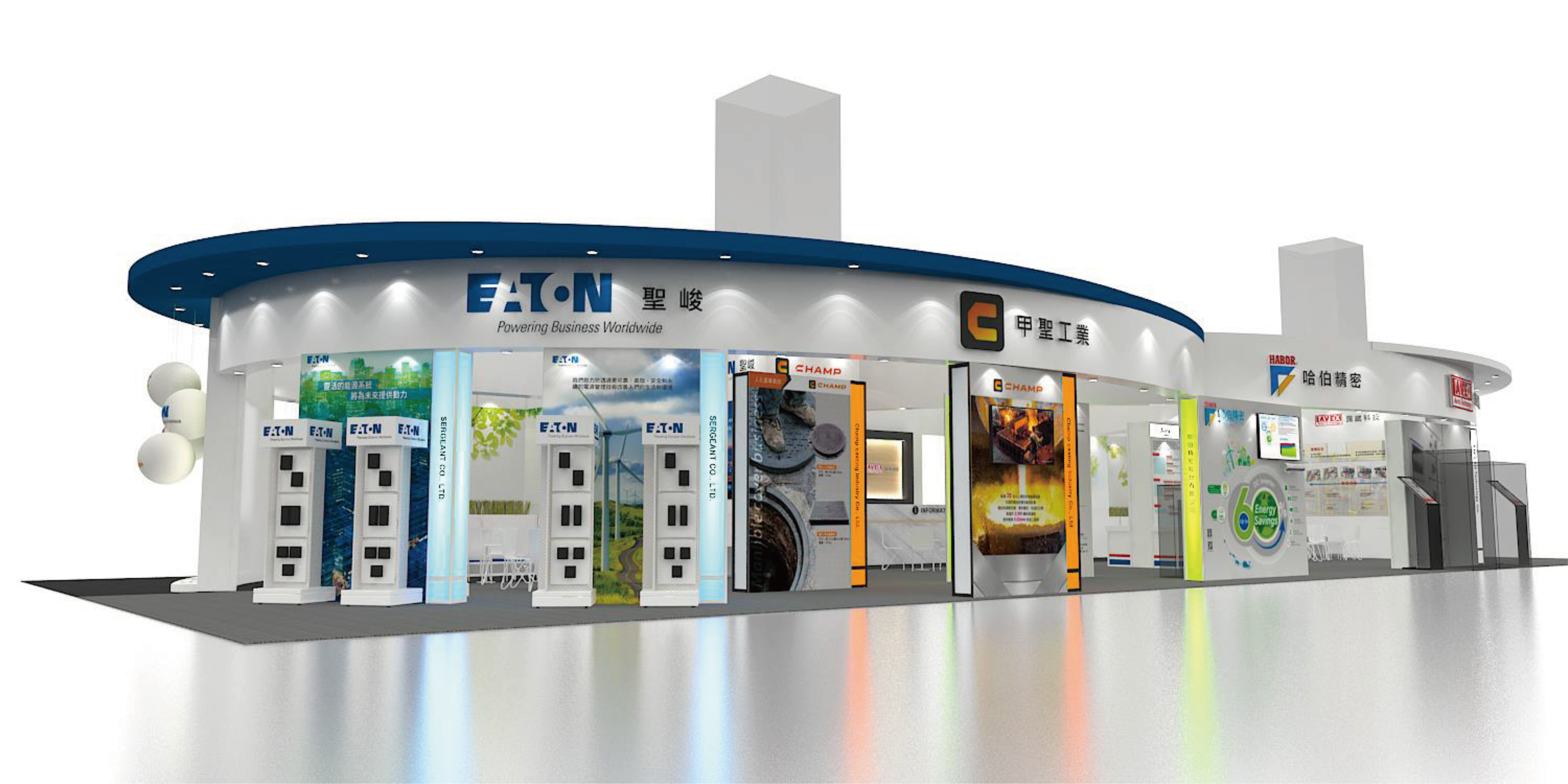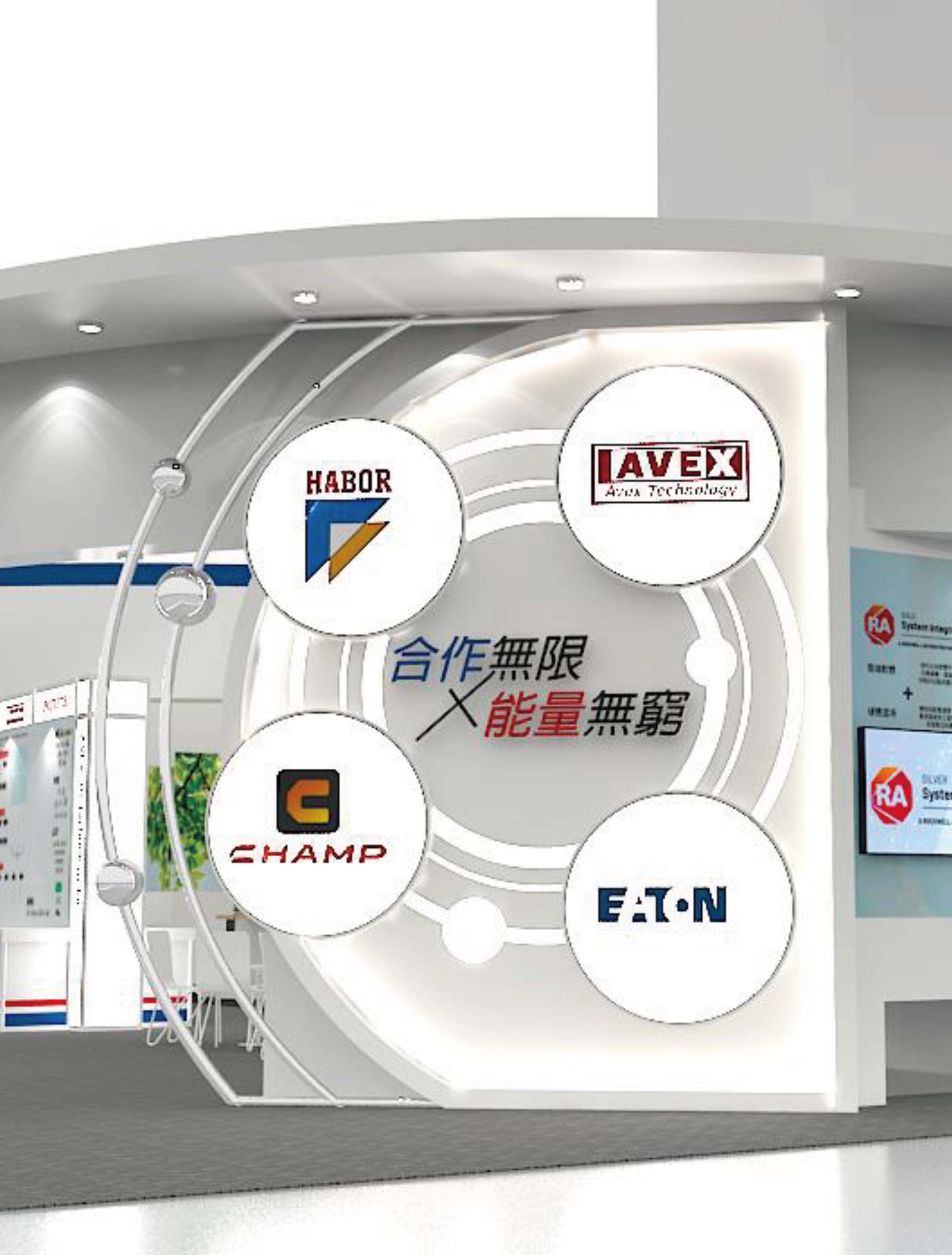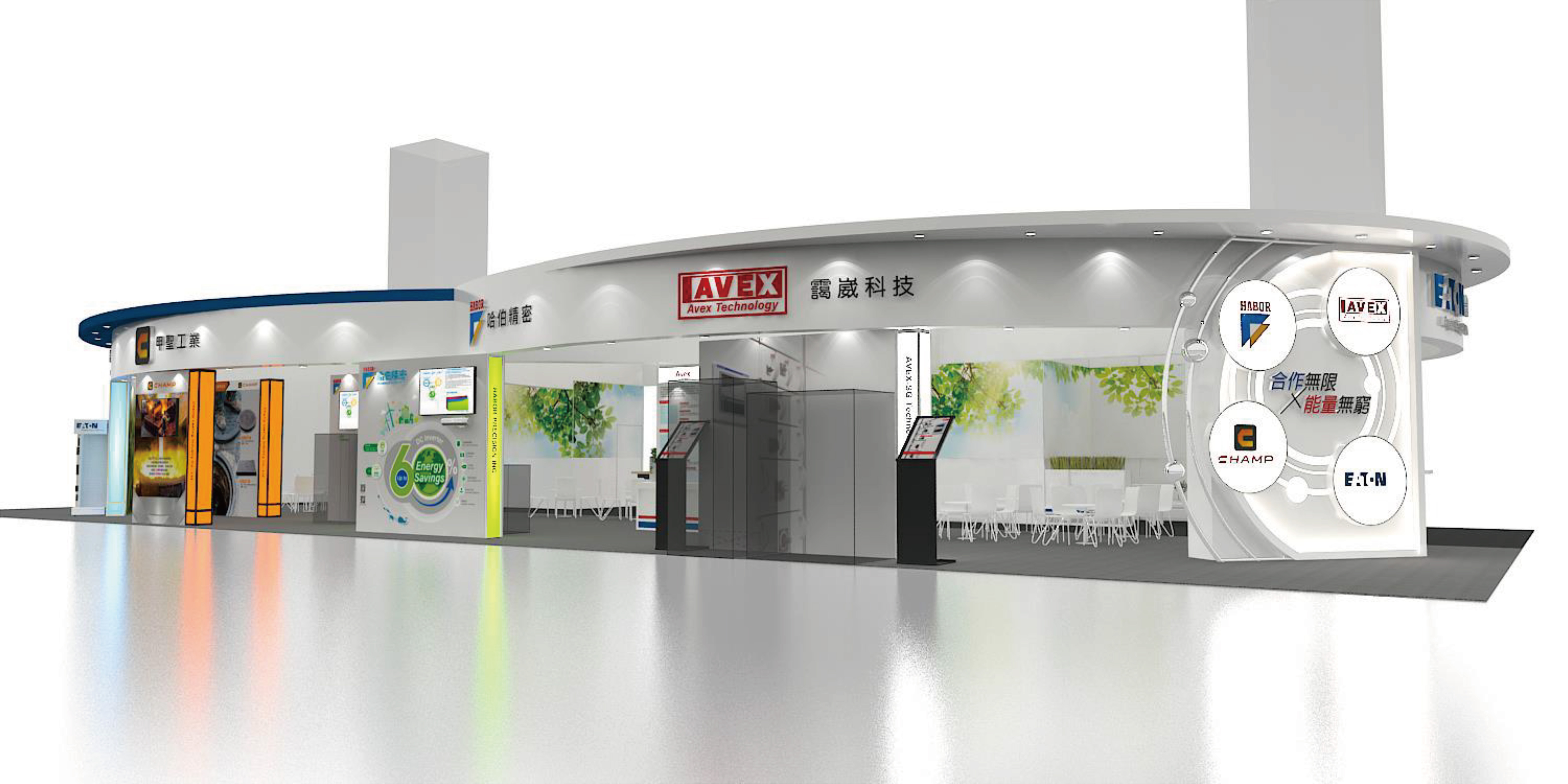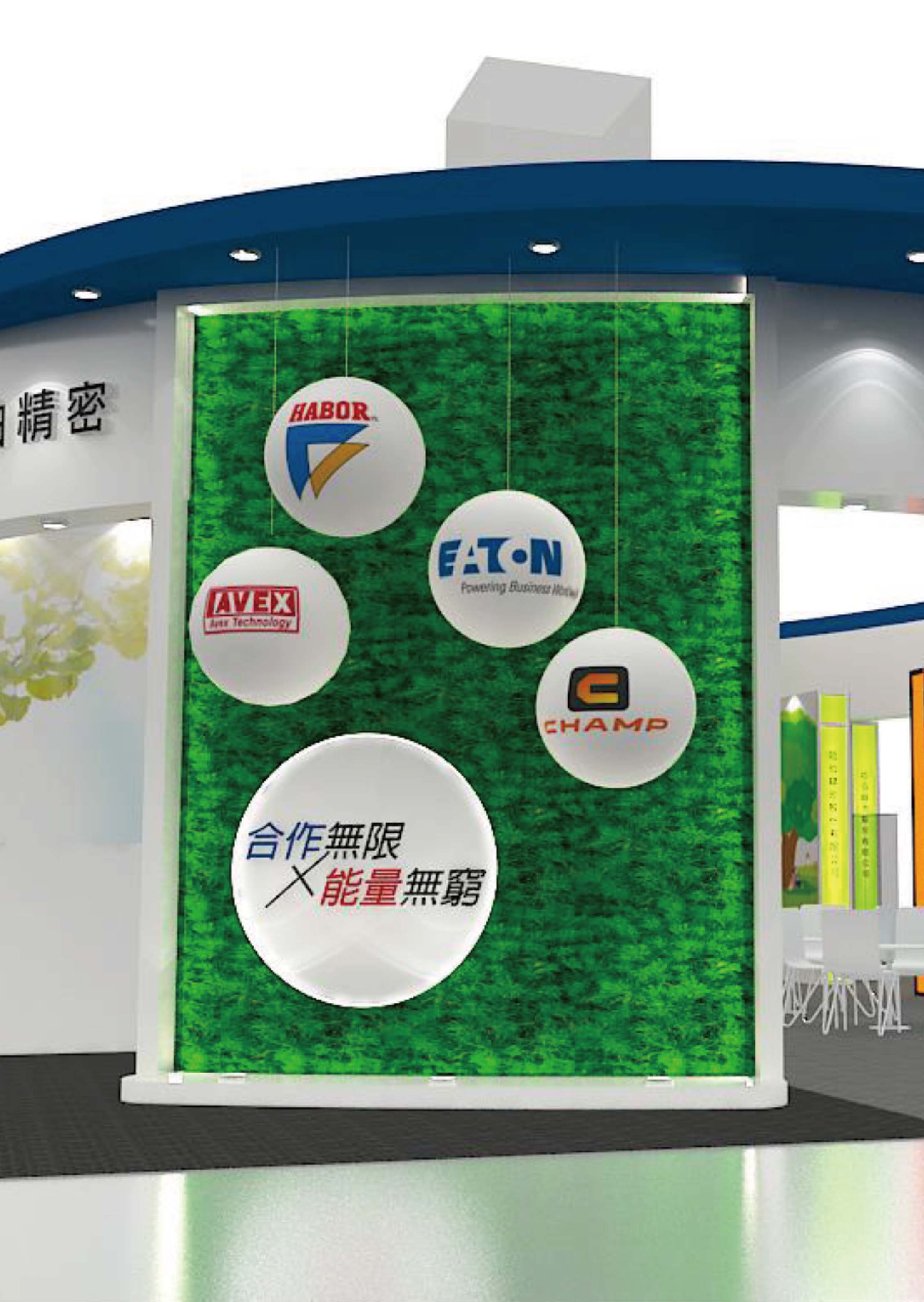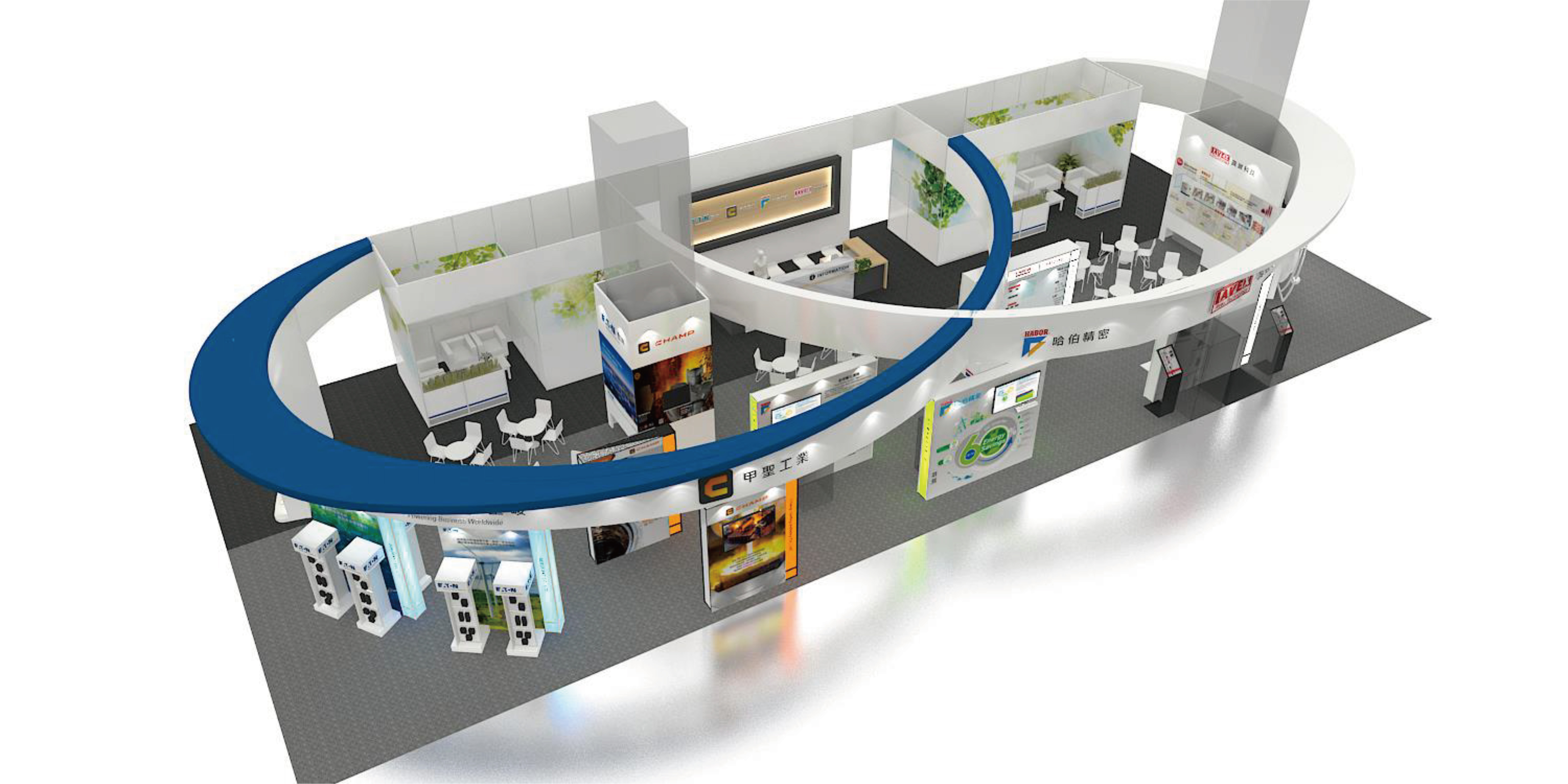 At the booth top, we used two arcs to connect, the symbolizing endless cooperation and boundless energy. The left and right sides are gradually shaded with blue and white respectively to create a gradient effect.